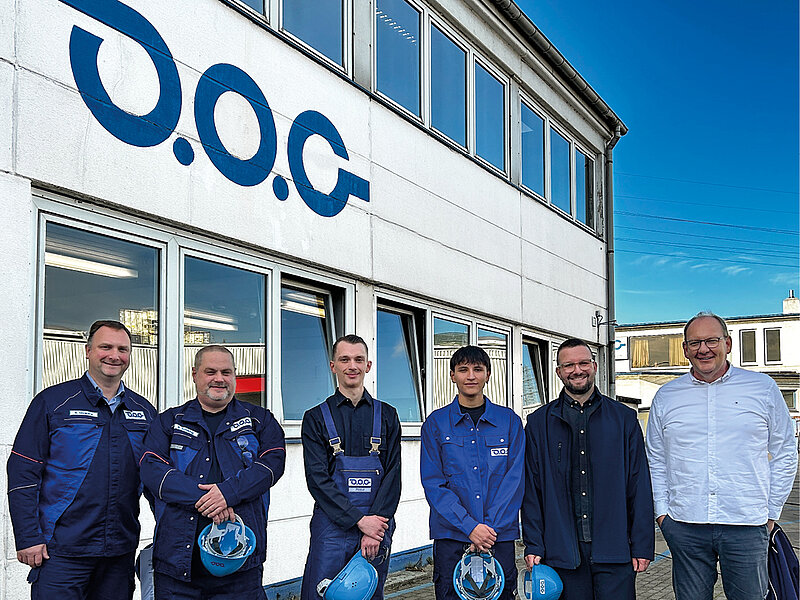 Behind the scenes, chemical technicians Mateo Noriega and Malte Peters, as well as Benedict Schwing, industrial master electrician (third, fourth, and fifth from right), ensure consistently high D.O.G quality and smooth processes.
